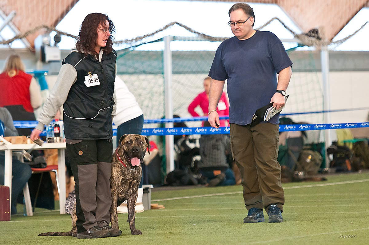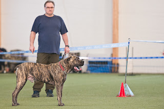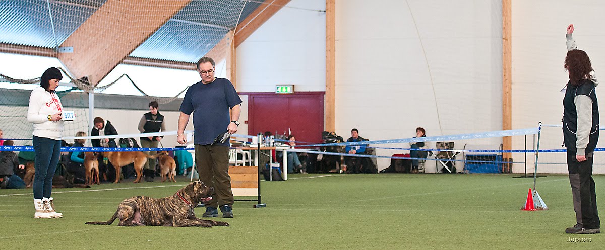 Begge gutta har nå vært ute på stevne i år, Ilunga hadde første stevne 1. mai i Moss. Han gjentar suksessen fra slutten på fjoråret, og "går mastiff" når vi kommer inn i ringen. Hva skal vi gjøre med det da? Jo, nå SKAL vi ha stevnetrening, vi SKAL endre belønningssystemet (over til viktigere/mer SOSIAL belønning, og ikke MATbelønning). Vi skal heretter belønne med mat når vi avlslutter treninga, og tantene får HELLER IKKE lov å belønne. Detta blir regime.
