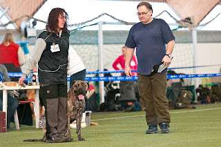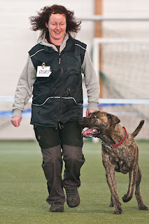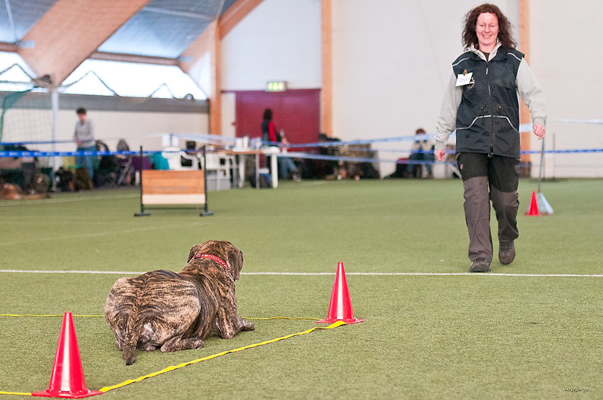 Etterhvert skulle man inn i ringen igjen da, og vi kastet oss over ringbåndet - jeg sier "Fot" til Nurk, og han er BORTE! Going totally autistisk mastiff! Dette stresser selvfølgelig meg noe så hemningsløst; dommeren sier "Ta det med ro nå...", siden han antageligvis ser hvor innmari gira jeg blir, og Nurk "går i seg selv" så til de grader. Vi trasket (jadda, sier og skriver) ut i fot - og det var forferdelig...er jo vant til at nurk gir meg energi og glede og "se så flinke vi er" følelse, dette var fullstendig dødt... grusomt. Men vi berget foten til en femmer, nulla på sitt under marsj - men da KREVDE jeg at han satt seg, pokker heller, snudde meg og sa sitt! og sitt! en gang til, for dette må han gjøre. Og da løsnet han jaggu, mer og mer etterhvert...!