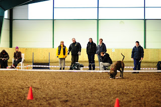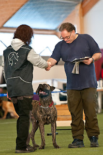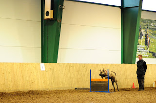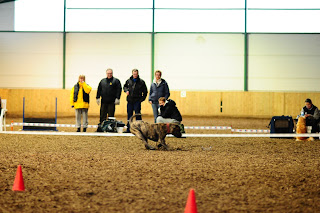 Så, var det etterhvert vår tur, sitt gikk fint, dekk gikk fint. Fot gikk ikke fullt så fint, han demper veeeeeldig ca. 30 meter ut i fot. Dette må jeg ta på egen kappe, og gjøre noe med. Akkurat hva jeg skal gjøre med det vet jeg ikke ennå ;) er veldig i tenkeboksen. Men vi skal løse det og! Sitt under marsj nulla vi - han la seg etter å ha sittet en laaaang stund... Innkalling gikk kjempefint, ruta gikk kjempefint, neseprøve gikk kjempefint, hopp over hinder gikk KJEMPEFINT (for FØRSTE gang i konkurranse hoppa han tilbake over hinderet med apporten!!!!) - trening betaler seg!!!! (Og da BLÅSER vi i at jeg måtte gi en dk for å få han til å hoppe ut etter apporten). Så, avstand - som også gikk kjempefiiiiint, han gjorde momentene! Etterhvert! Jeg aner ikke hvor mange dk det ble, men so what, vi er ett skritt videre!!!